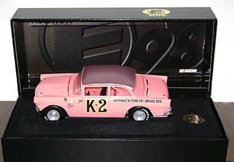 That would have been the Intimidator's first race car. It was 1970 and Dale was only 19 years old. Dale's neighbors, Ray and David Oliver, let him have their 1956 Ford. Dale's father, Ralph, built the engine and family friends, Wayne and Frank Dayvault and their cousin Gregg helped tune it. When it came time to paint the car, they mixed paint that they thought would go with the purple metal-flake roof, but some how the paint came out pink. They couldn't afford to re-paint the car, so Wayne went ahead and painted DAYVAULT'S TUNE-UPS & BRAKE SER. on the side, and Dale raced the pink car on dirt tracks around Charlotte, mainly at the old Concord Speedway. He never raced a pink car at Kingsport Speedway though.